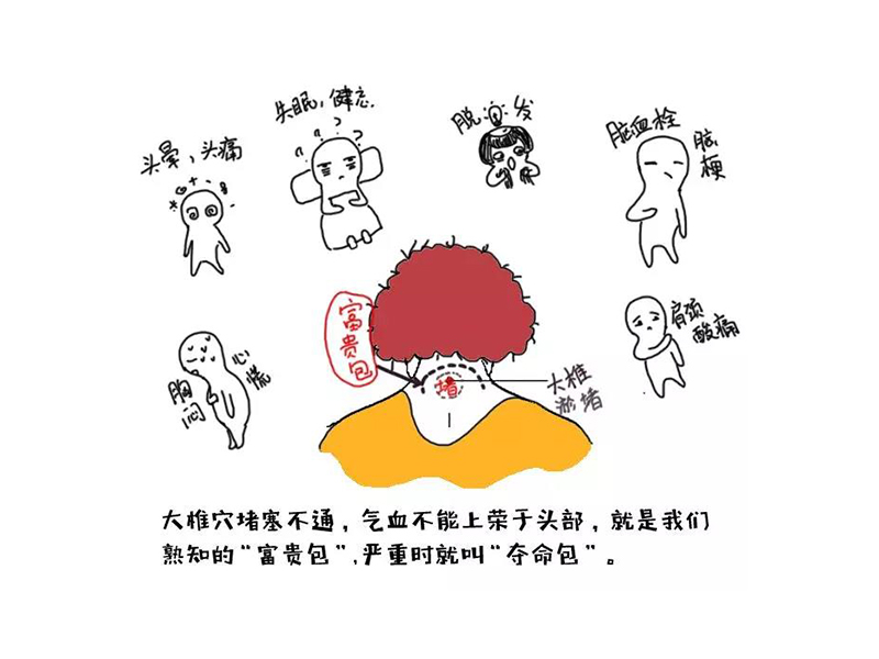 大椎穴又名阎王夺命锁,它是我们人体的十字路口,有着承上启下的作用,如果大椎穴堵塞不通,气血不能上荣于头部,就是我们熟知的富贵包。