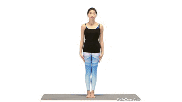 山式站立于瑜伽垫上,双脚打开,与肩同宽;
