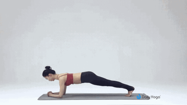 呼气,同时慢慢弯曲手臂,先将腰部下落,然后依次胸部,颈部慢慢着地,变成之前的俯卧的体式;