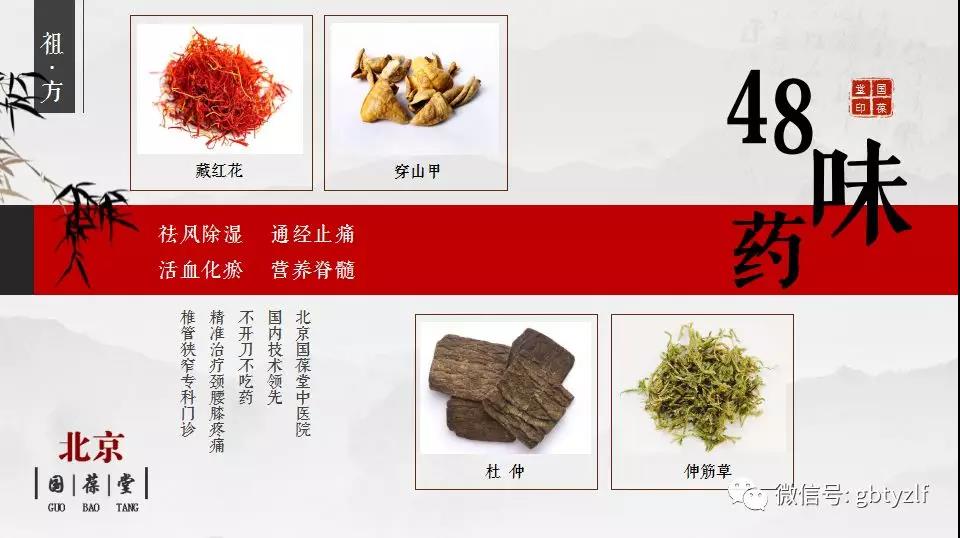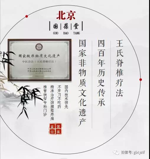 北京有一家国葆堂中医,是国家级非物质文化遗产项目“王氏脊椎疗法”的传承基地。王氏脊椎疗法是王氏祖上传承自清朝顺治年间近400年的宫廷御医专门治疗椎管狭窄、颈腰椎、脑血栓等疾病的传统中医疗法。在乾隆年间王氏第四代传人御医王昭恩为王爷诊治的疾病(脚底踩棉花感等典型症状)经证实即为椎管狭窄,说明在近400年前,我们传统中医即找到了治疗椎管狭窄的有效方法。