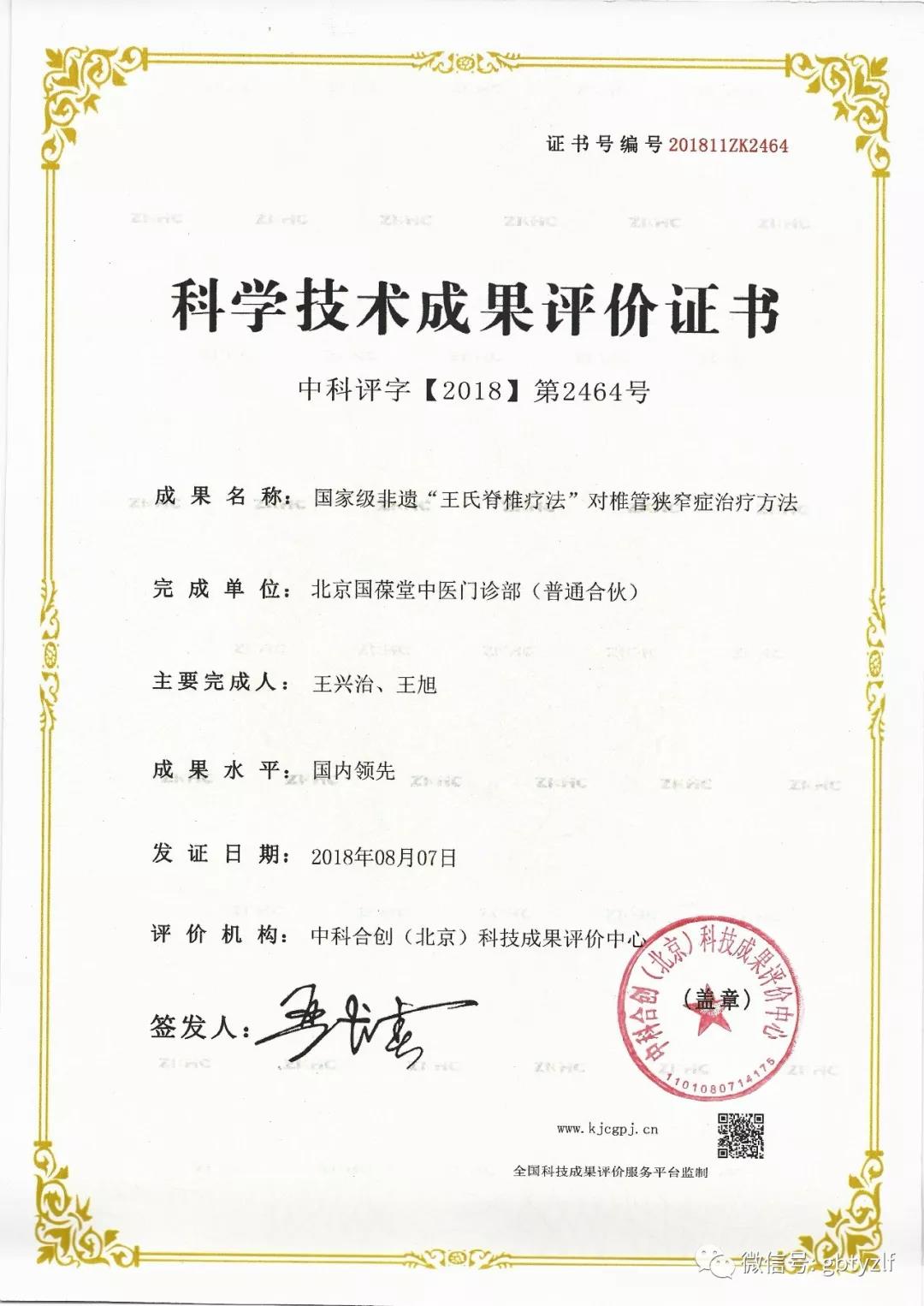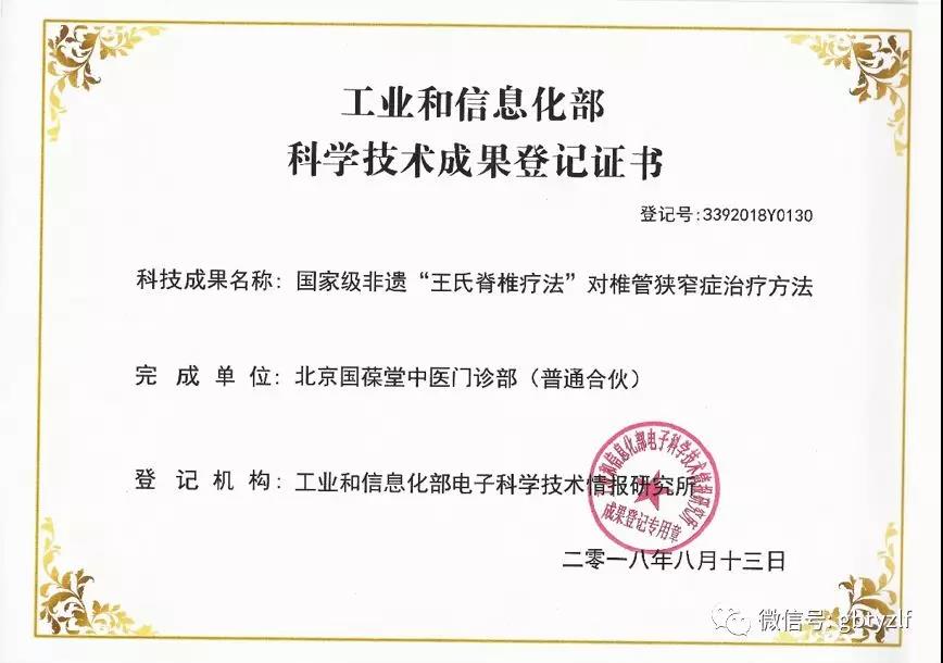 2018年,王氏脊椎疗法对椎管狭窄症的治疗方法获得工业和信息化部颁发的科学技术成果认证,表明王氏脊椎疗法在非手术治疗椎管狭窄方面走在了国内领先行列。