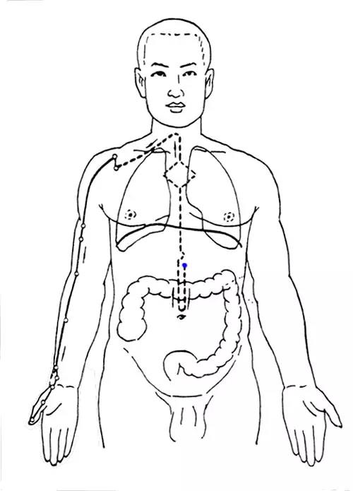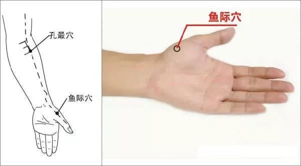 说明:“鱼际穴”在靠近大拇指的两骨中间位置,按揉时,拇指要靠向第一掌骨发力,肺有疾时此处也会痛感明显,可是有人开始时痛感不重,当把“孔最穴”疏通之后,感觉才会出现。