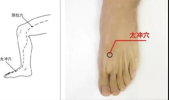 2、“太冲穴”在大脚趾与二脚趾分叉处的凹陷中,用食指向脚踝方向勾住此处然后点揉,如果有痛点需要疏理。